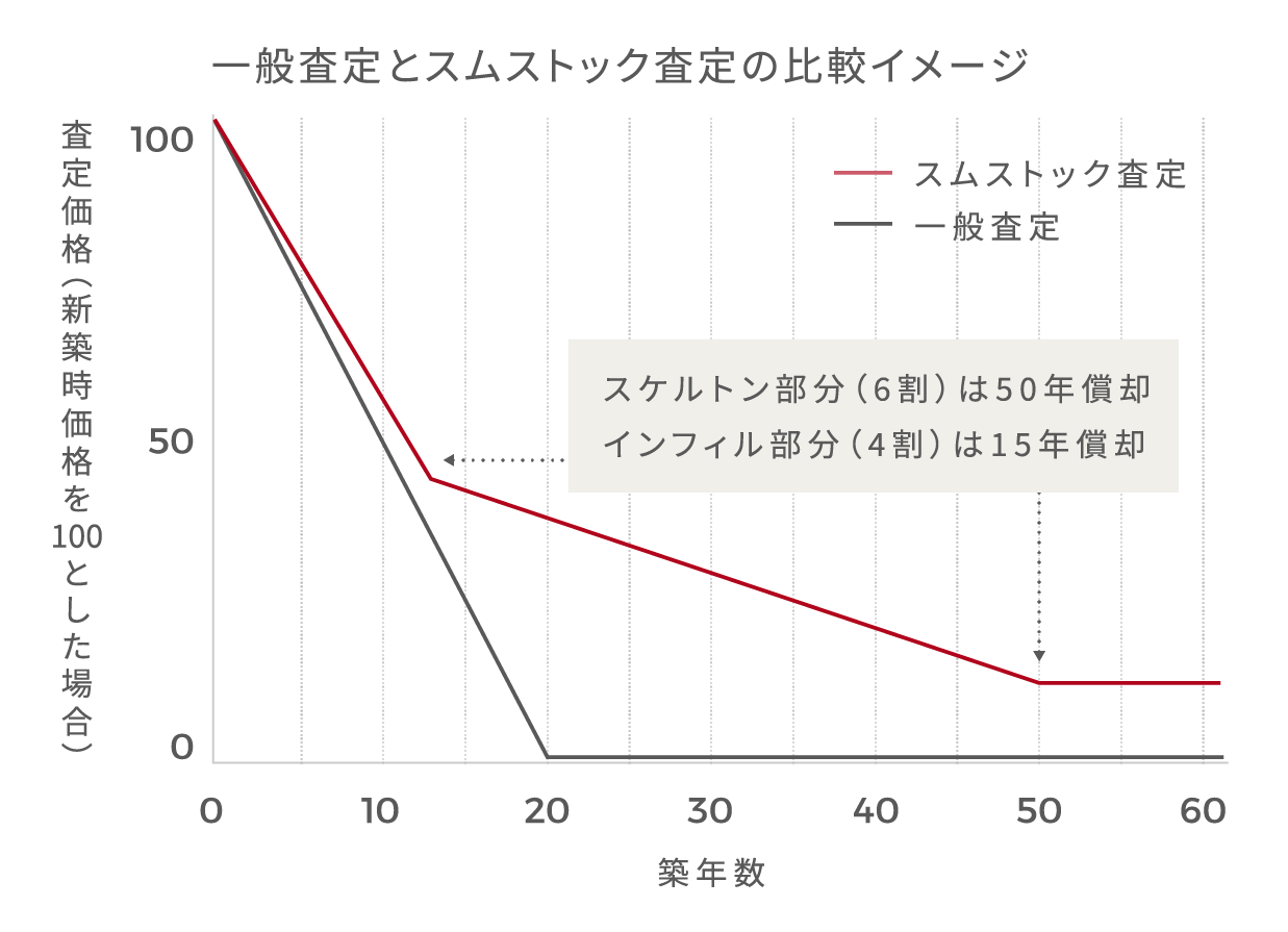 右のグラフはスムストック査定と一般査定の査定価格を築年数であらわしたものです。築15年から開きが生じ、一般査定では20年で建物価格がゼロに。スムストック査定では20年後もスケルトン部分の価値が認められ、築年数が経っても建物は評価されます。加えて、リフォームでも評価がアップします。一般査定で評価がつかなかった建物が、スムストック査定で大きな評価を得られる理由がここにあります。