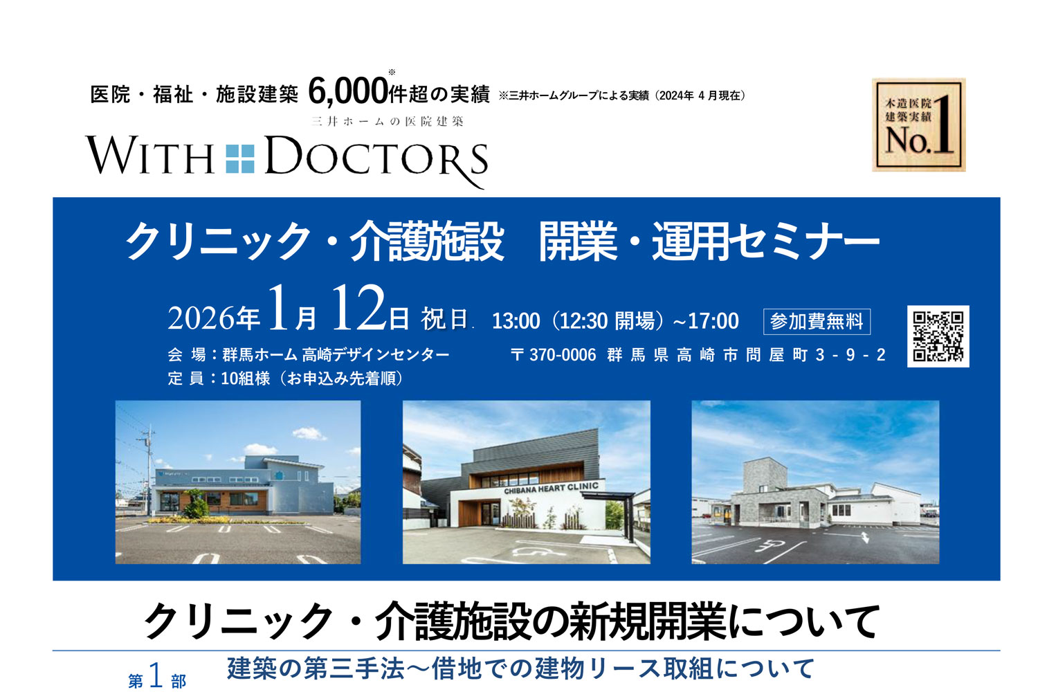 三井ホームの医院建築は、木造の持つ温もりと柔軟性を活かした設計が特長です。患者様に安心感を与える「木のやさしさ」に加え、自由度の高い構造によって診療科目や規模に応じた最適なプランニングが可能です。これまで全国で6,000件を超える医院・クリニックの建築実績を積み重ね、培ったノウハウを活かしながら、医療機器の配置や動線設計、待合室の快適性、スタッフの働きやすさまでトータルにご提案します。診療効率を高めつつ、地域に愛される医院づくりをサポートします。