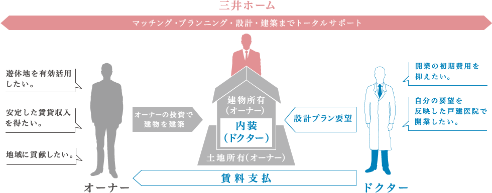 土地・建物を購入することなく、オーダーメイド感覚の戸建医院を実現します。