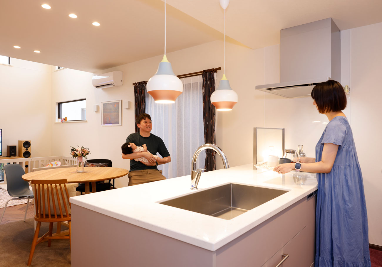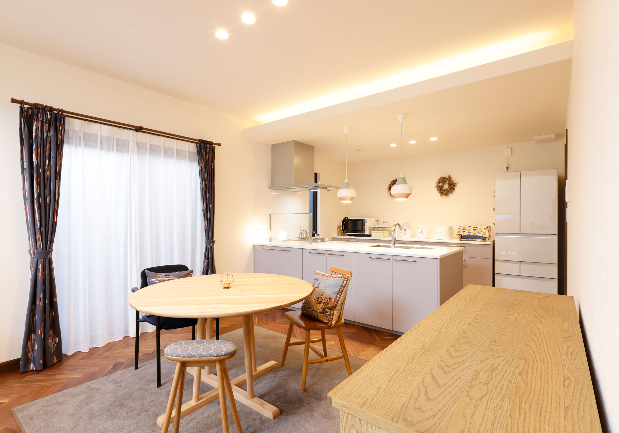 インテリアには北欧スタイルを取り入れ、落ち着いたアースカラーを基調としたデザインを選びました。特に床にはヘリンボーンを採用し、これが部屋全体に洗練された雰囲気を与えてくれています。また、収納スペースについても工夫し、特にキッチン周りはオープンな設計にして圧迫感をなくしました。通路幅も広く取っているため、家族が一緒にキッチンに立っても快適に過ごせるのが魅力です。さらに、窓や内窓もデザイン性だけでなく、子どもたちが楽しめる工夫を取り入れました。家全体の収納力も高く、特に奥行きのあるスペースが多いため、日常生活での使い勝手も非常に良いです。
