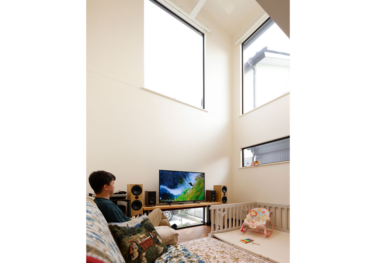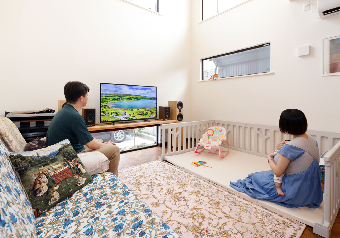 家づくりにおいて、私たちが特にこだわったのが「開放感」です。もともとは平屋を希望していましたが、土地の形状の関係で2階建てにせざるを得なかったため、少しでも広さを感じられるように吹き抜けを採用しました。吹き抜けの大きな窓からは光がたっぷり差し込み、家全体が明るく感じられるのがとても気に入っています。また、シーリングファンを設置することで、吹き抜けだけではなくデザイン性もアップし、シンプルでありながらも上質な空間が実現しました。この開放感のおかげで、家に入った瞬間に広々とした印象を受け、訪れる友人たちからも好評です。