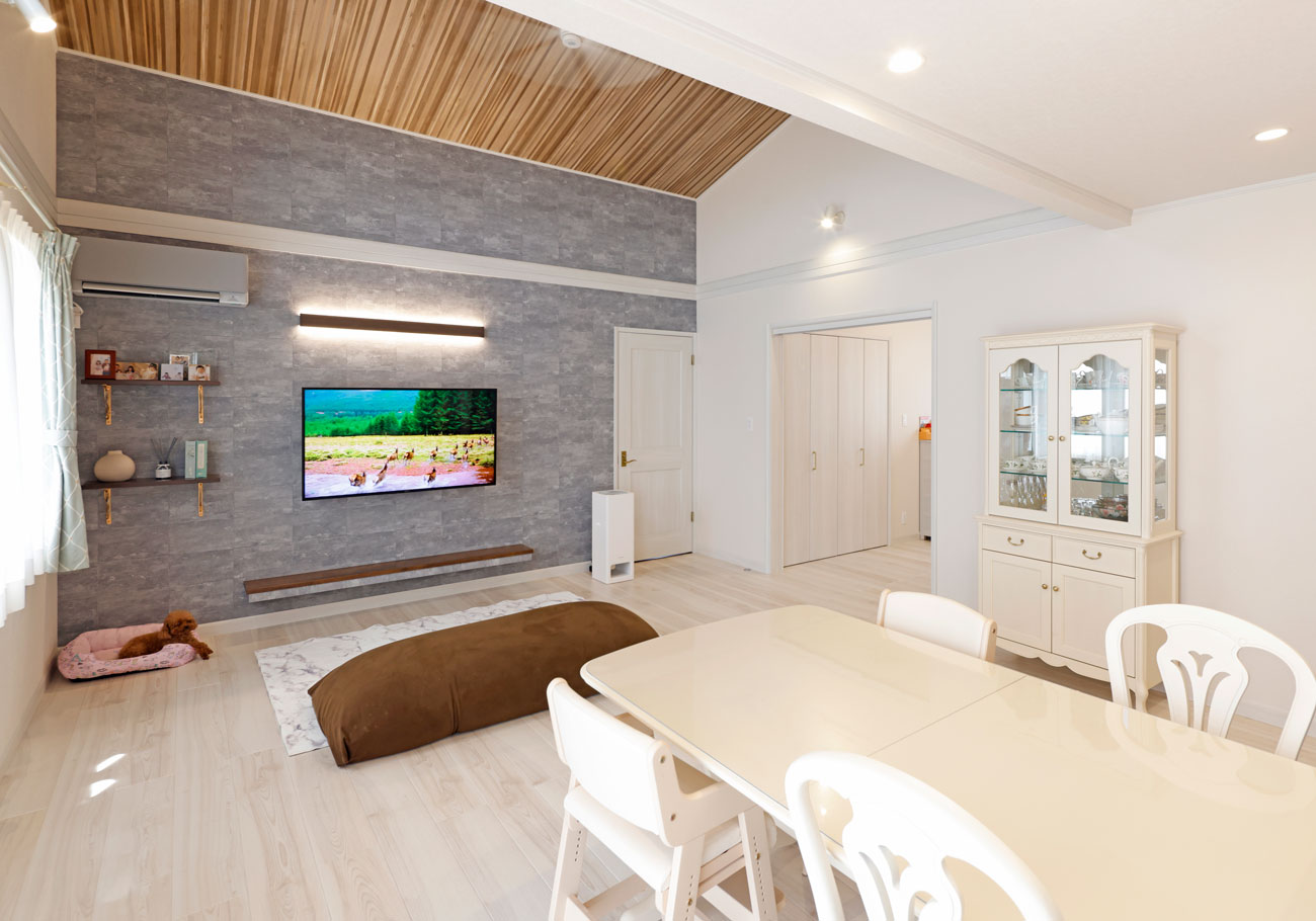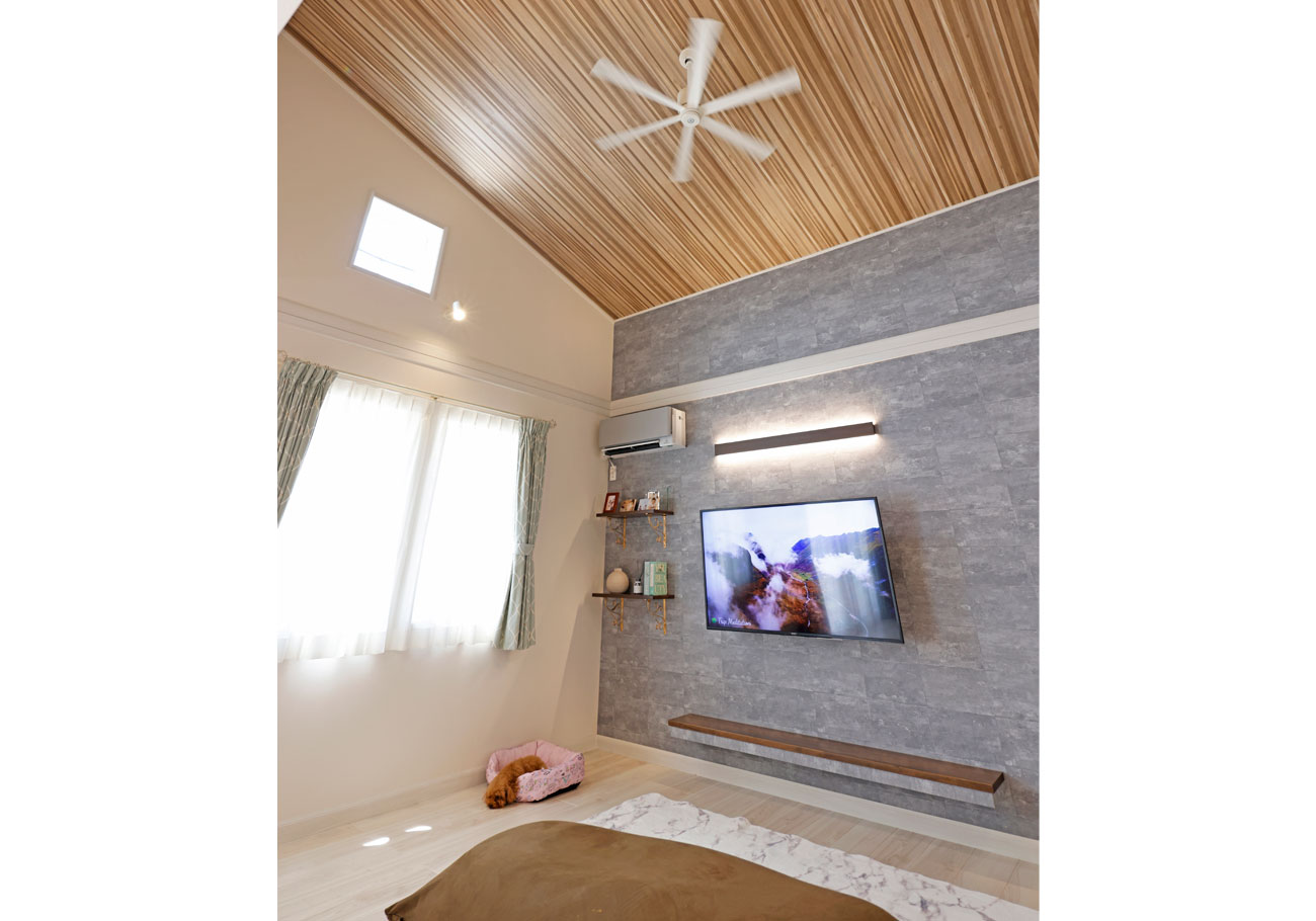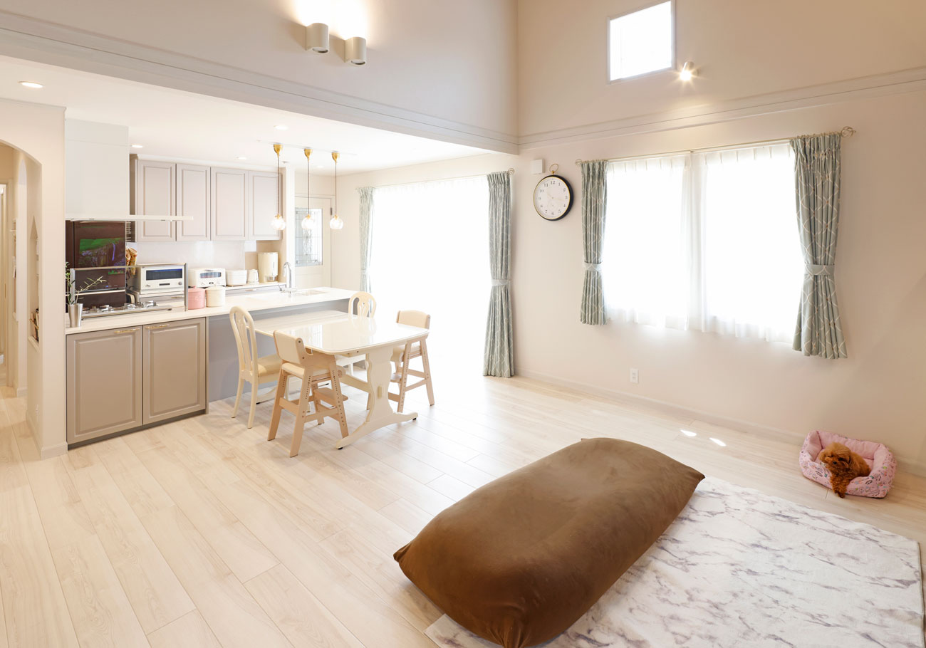 平屋を選んだ理由の一つとして、私たちは以前、マンションに住んでいて、ワンフロアの住みやすさを実感していたからです。階段のない平屋は本当に魅力的でした。また、子供とペットもいるので、生活がシンプルで動きやすいことが重要でした。三井ホームの家は高気密・高断熱である為、開放感のある勾配天井を取り入れても、外の気温に左右されない心地よい空間に満足しています。特に床暖房がとても快適です。夏も家に帰ると涼しく感じることができ、冷房の効きも良くて驚いています。動きやすさだけでなく、温度の面でも快適な平屋で、毎日楽しい日々を送っています。