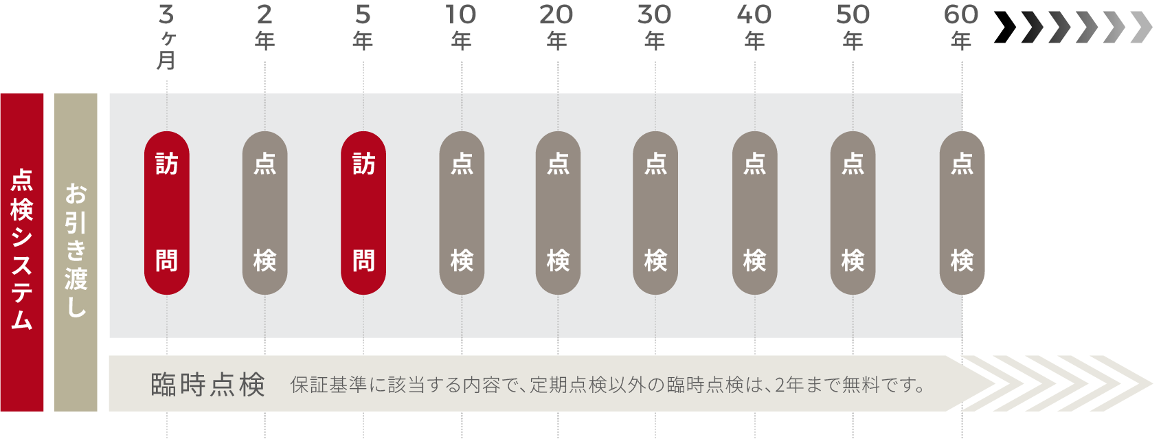 建物お引渡し後60年にわたり、10年ごとに点検を実施し(2年、10年、20年、30年点検は無料)、建物品質・性能の管理をいたします。