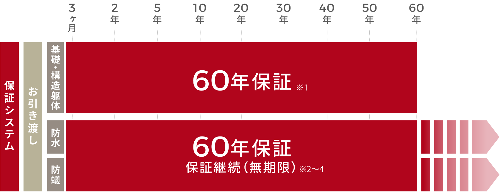 定期点検の結果、必要な有料メンテナンス工事を実施することにより、基礎と構造躯体を最長で60年間保証いたします。