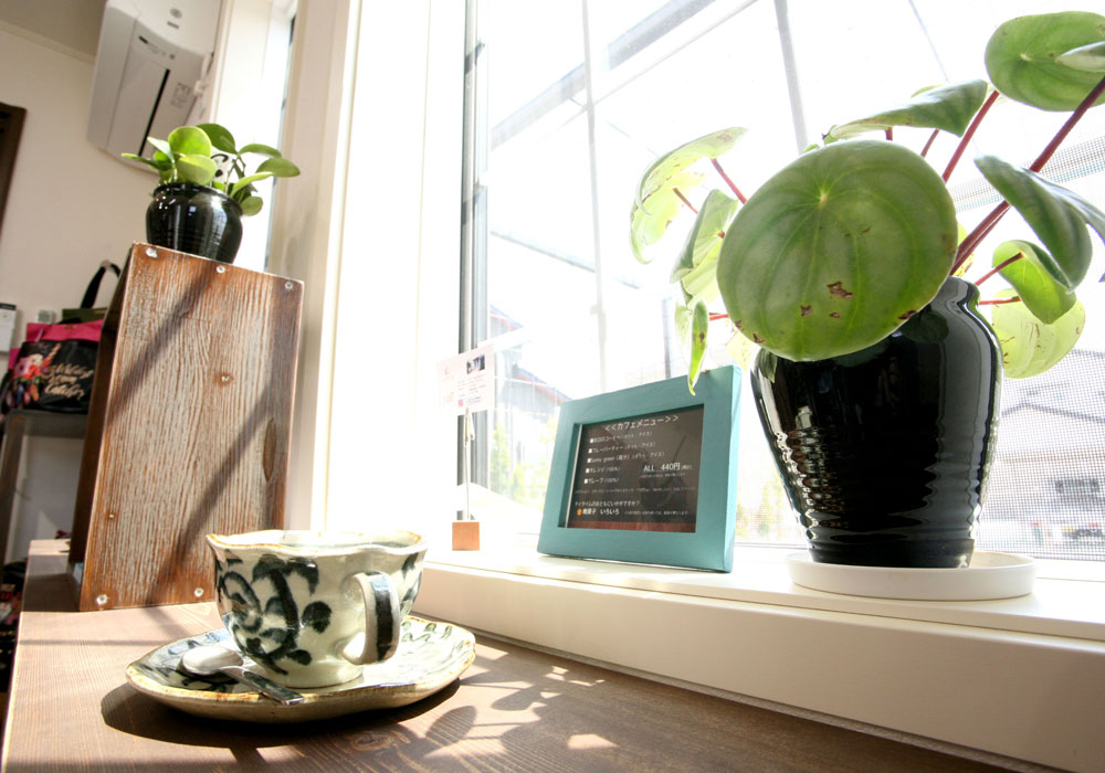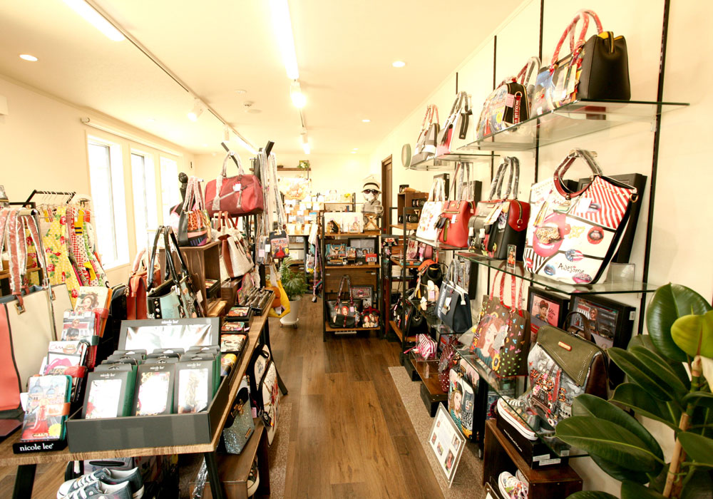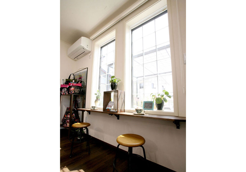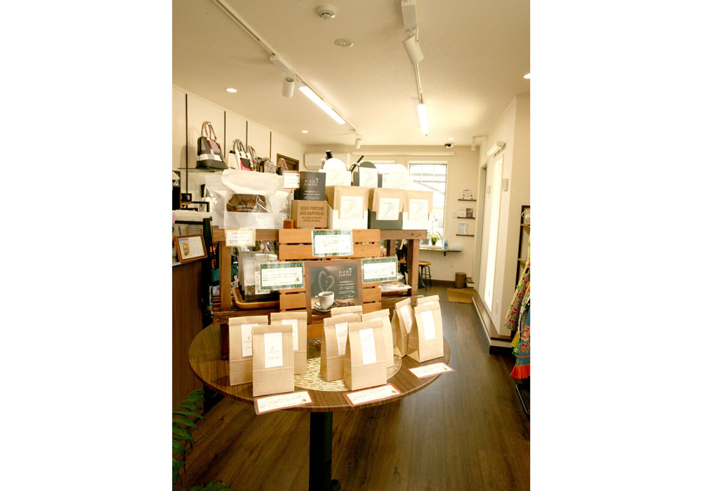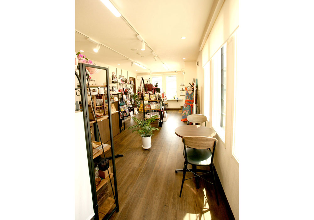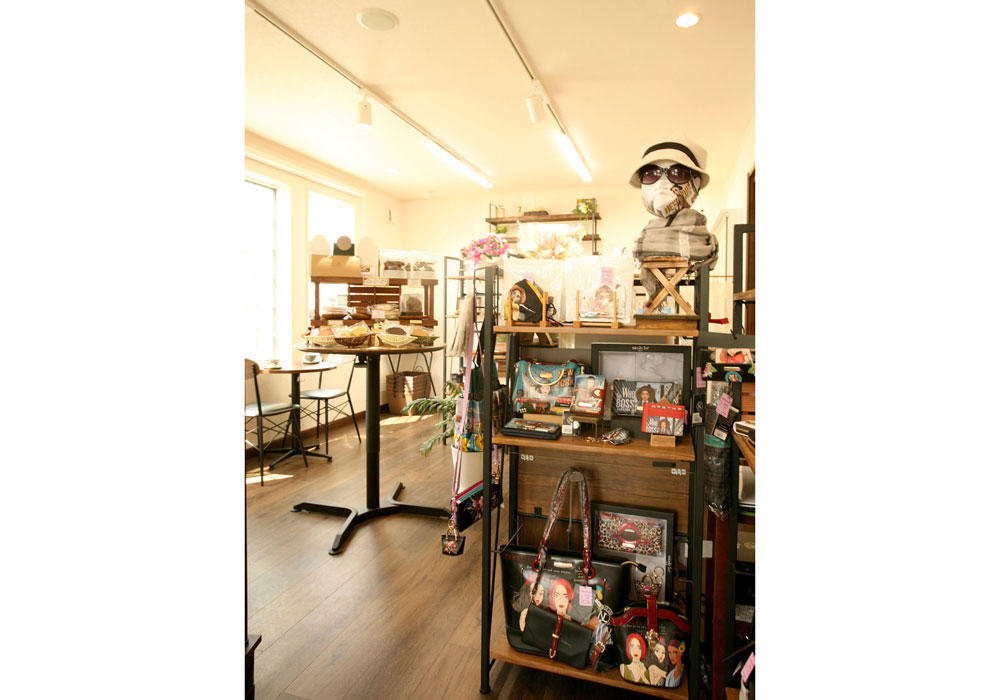 お店では、厳選したバッグを中心に、ハンドメイドのファッション小物なども並べています。店舗内も使いやすく、窓から光が差し込む明るい店内で、ゆっくりと商品をお選びいただける素敵なショップになりました。窓辺のカフェスペースも居心地が良いと好評で、焼き菓子を楽しみながら、ゆっくりお寛ぎいただいています。
