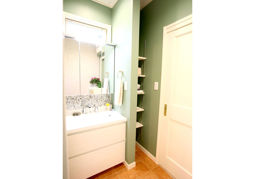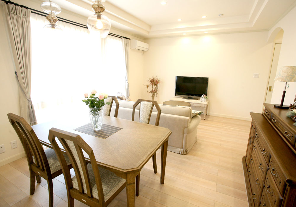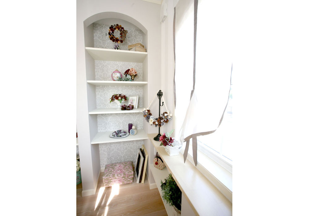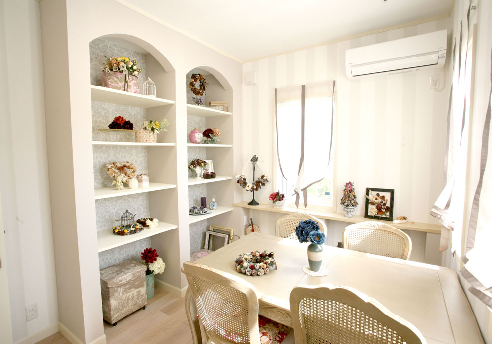 自宅では、木の実のリースや「カルトナージュ」という厚紙工芸の教室をしているので、展示ディスプレイを兼ねたレッスンルームを作っていただきました。2面の窓から明るい光が差し込む素敵な空間に仕上がり、生徒さんに「おしゃれなカフェのよう」と大変好評です。