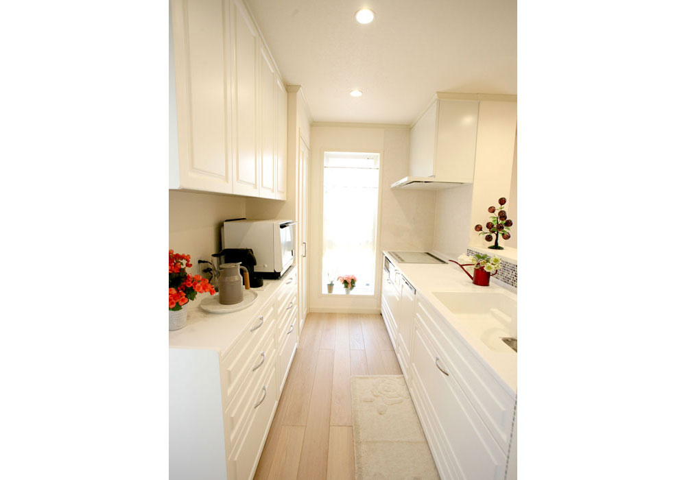 また、三井ホームさんオリジナルの「Kシリーズ」のキッチンは、彫りのある木製の白い扉にゴールドとシルバーの取っ手がとても素敵です。家電のサイズに合わせた棚など、細かな配慮をしていただいたので、とても使いやすく助かっています。