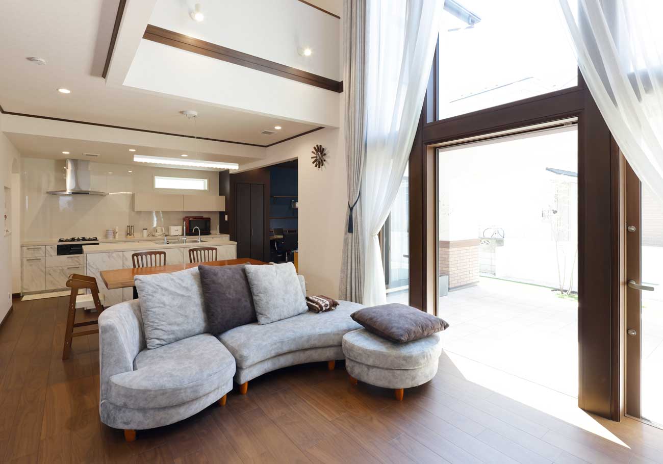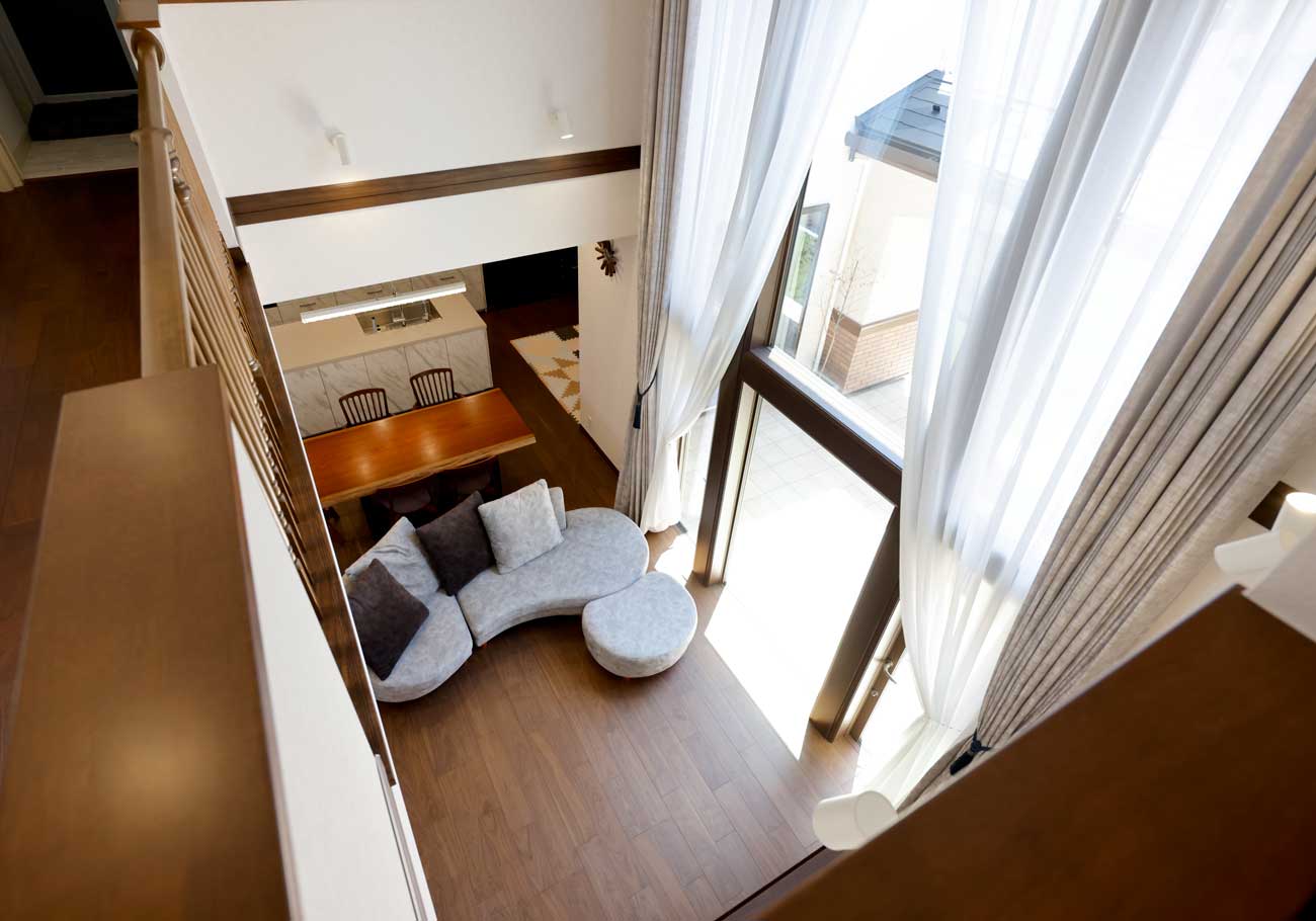 こだわりたかったリビングの天井飾りを、設計の清水さんから本当にたくさんの模様をご提案いただき、イメージをかたちにしてもらいました。この部分にこだわることでこの家が理想通りになったと感じています。出来あがって初めて、この窓と吹き抜けを見たときは「本当に建ててよかったな」と率直に思いました。