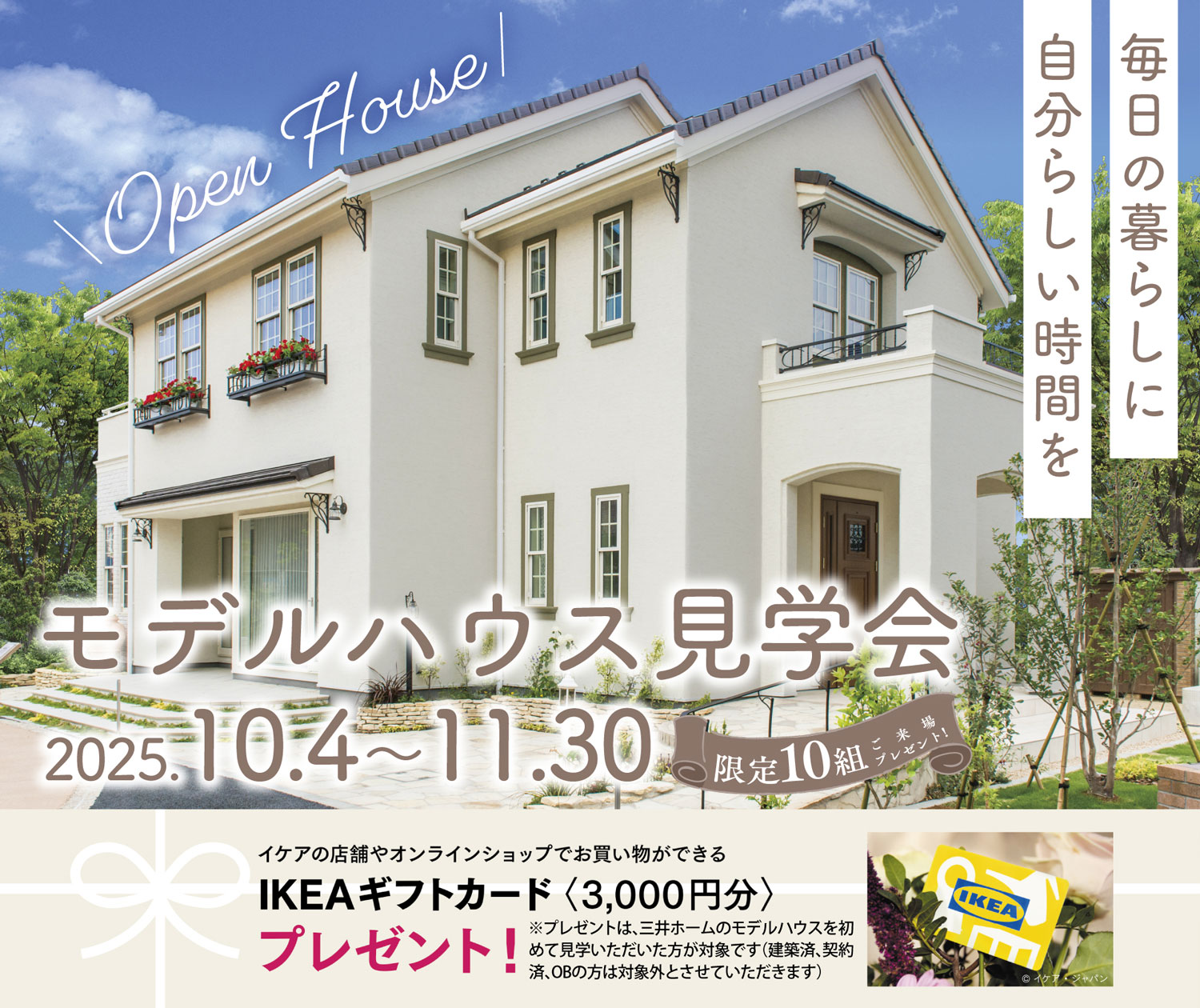 限定10組にプレゼントIKEAギフトカード(3.000円分)※プレゼントは、三井ホームのモデルハウスを初めて見学いただいた方が対象です(建築済、契約済、OBの方は対象外とさせていただきます)