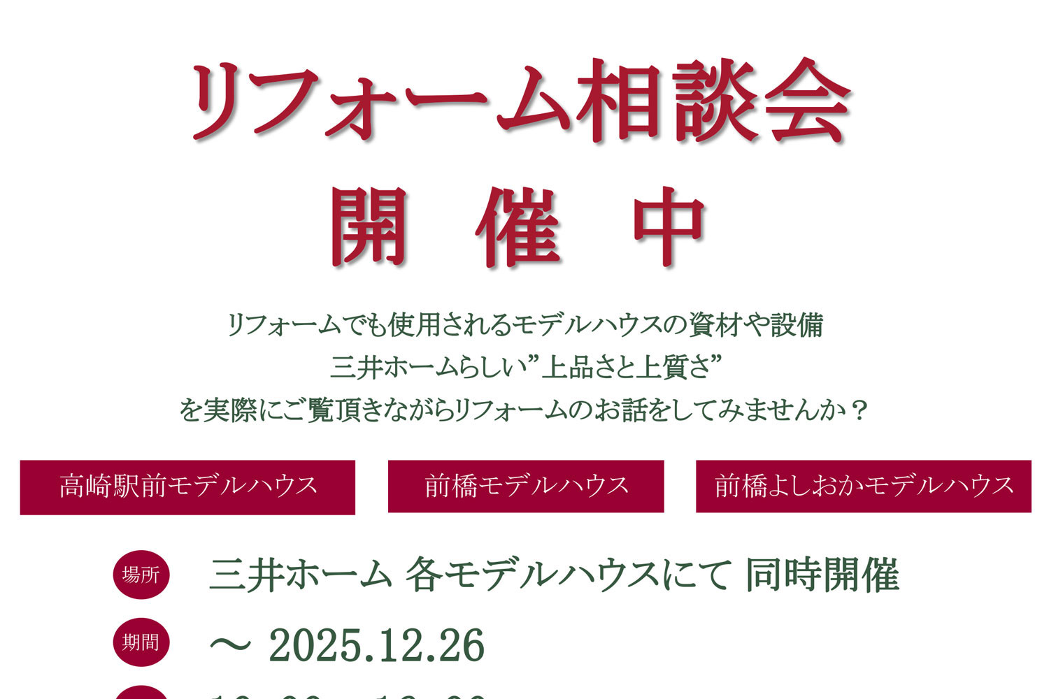・コンサルティングサロン、リフォームセンター、モデルルームは再開いたしましたが、ご来店の際はご予約をお願い申し上げます。 ・お打合せの方法等につきましては、お客様のご要望(対面・WEBオンライン)を伺いながらご相談の上対応させていただきます。 ・弊社、社員在宅勤務推奨期間につき、資料の送付やご連絡にお時間を要する場合がございます。あらかじめご了承ください。